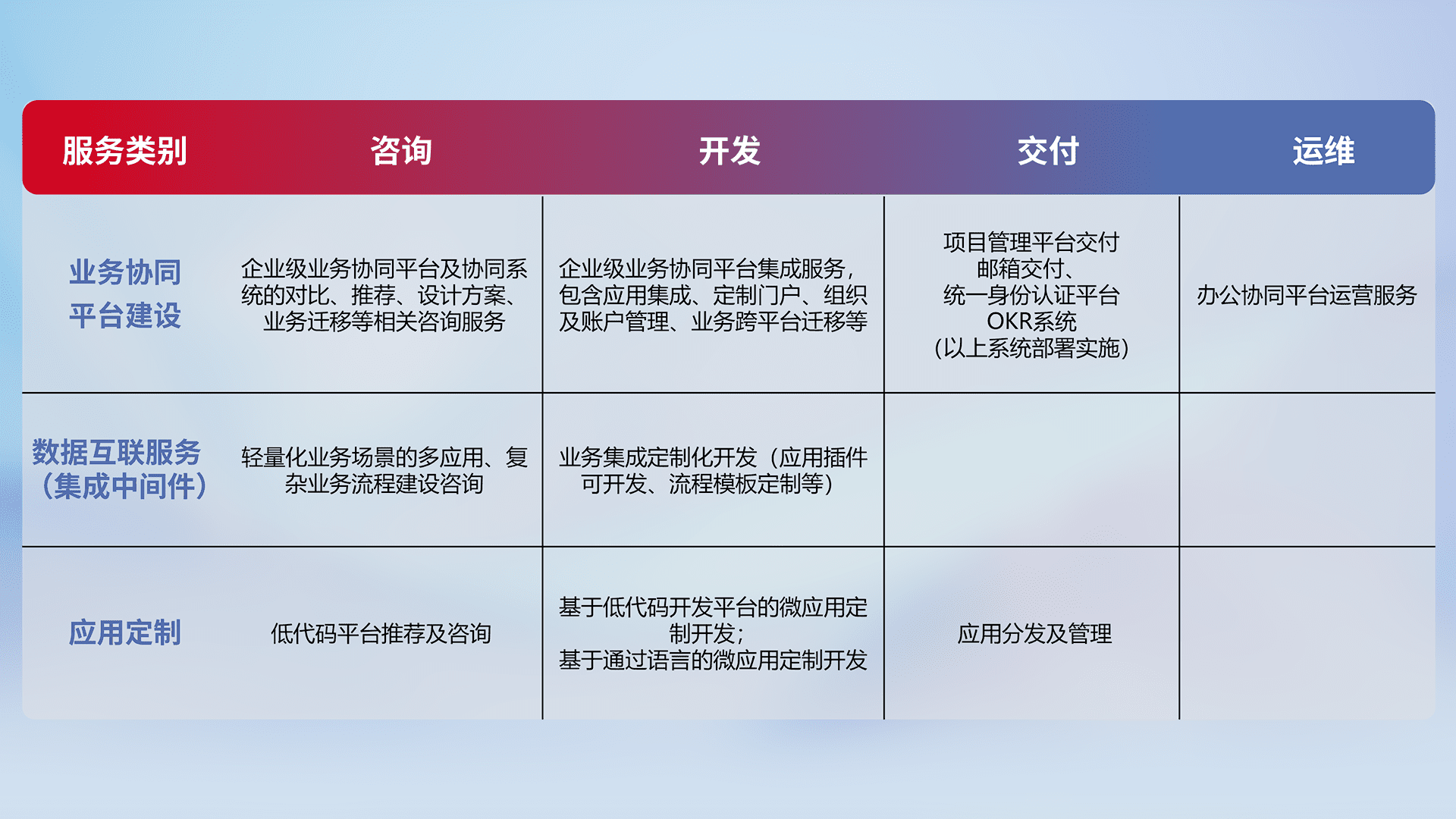 针对钉钉、、企微、、、、IDaas等平台级产品提供产品的规划、、、、方案、、、交付、、、、定制化开发等服务,,实现如统一协同办公、、、智能客户服务、、混合会议管理、、智能数据查询、、等业务场景,,,实现数字化转型。。