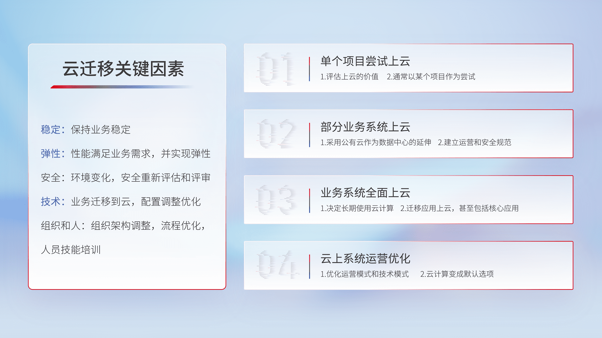 结合实际业务,,,从规划设计、、云平台选型、、云原生改造、、、、数据迁移、、、集成交付,,,,迁移全过程为客户识别最佳上云路径,,做好风险识别管理,,,,设计网络架构、、、、身份权限、、、安全审计合规、、操作审计、、日志审计、、监控告警策略、、多站点容灾设计等,,,,对云上基础设施进行整体规划,,,提升IT治理水平,,以满足弹性、、、、高可用、、、高性能的需求。。。。