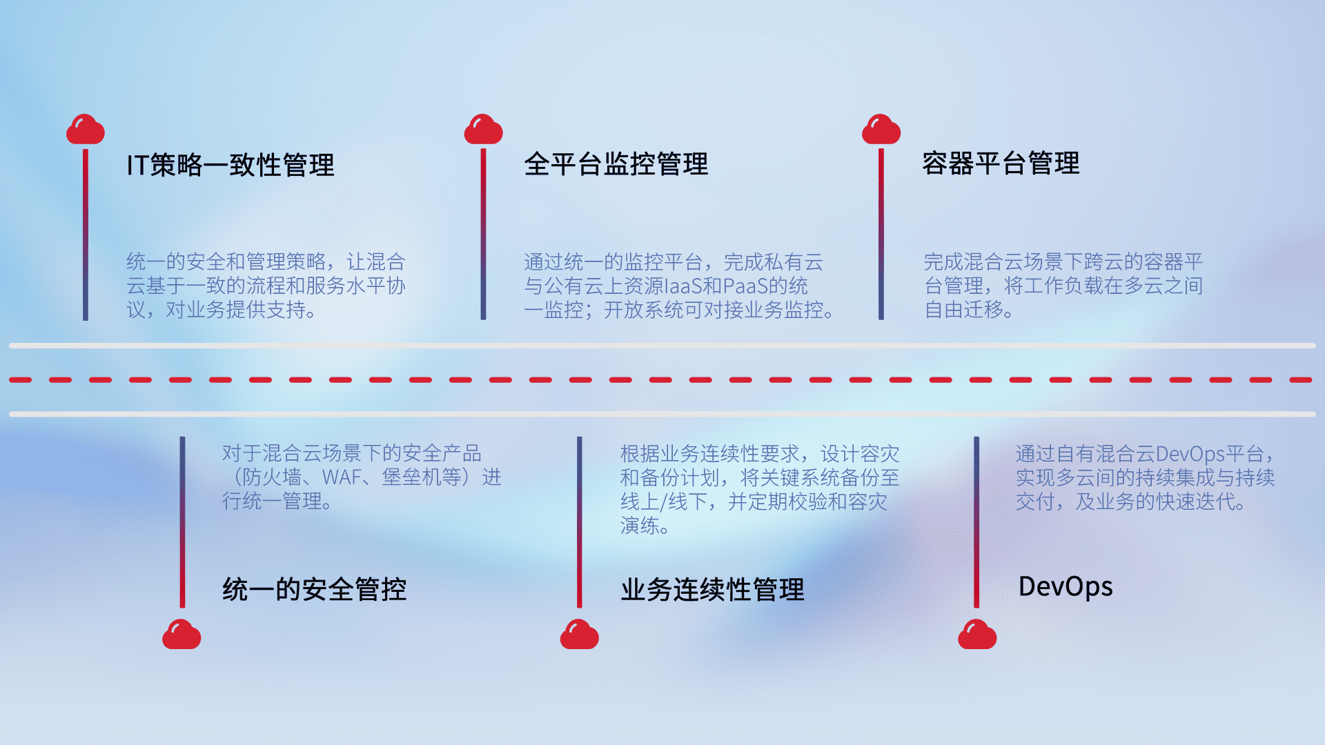 通过多云纳管,,,,以统一的资源数据模型把客户的云资源进行抽象和封装,,,进而实现对多云资源的统一操作,,,保障云资源管理的可靠性、、稳定性与可用性。。。。量身定制化运维内容,,配置、、、开发运维、、补丁管理、、、、备份、、、监控、、、认证和访问管理、、审计和日常巡检等,,,保障在用云过程中的可靠度,,,,稳定度以及高可用率。。