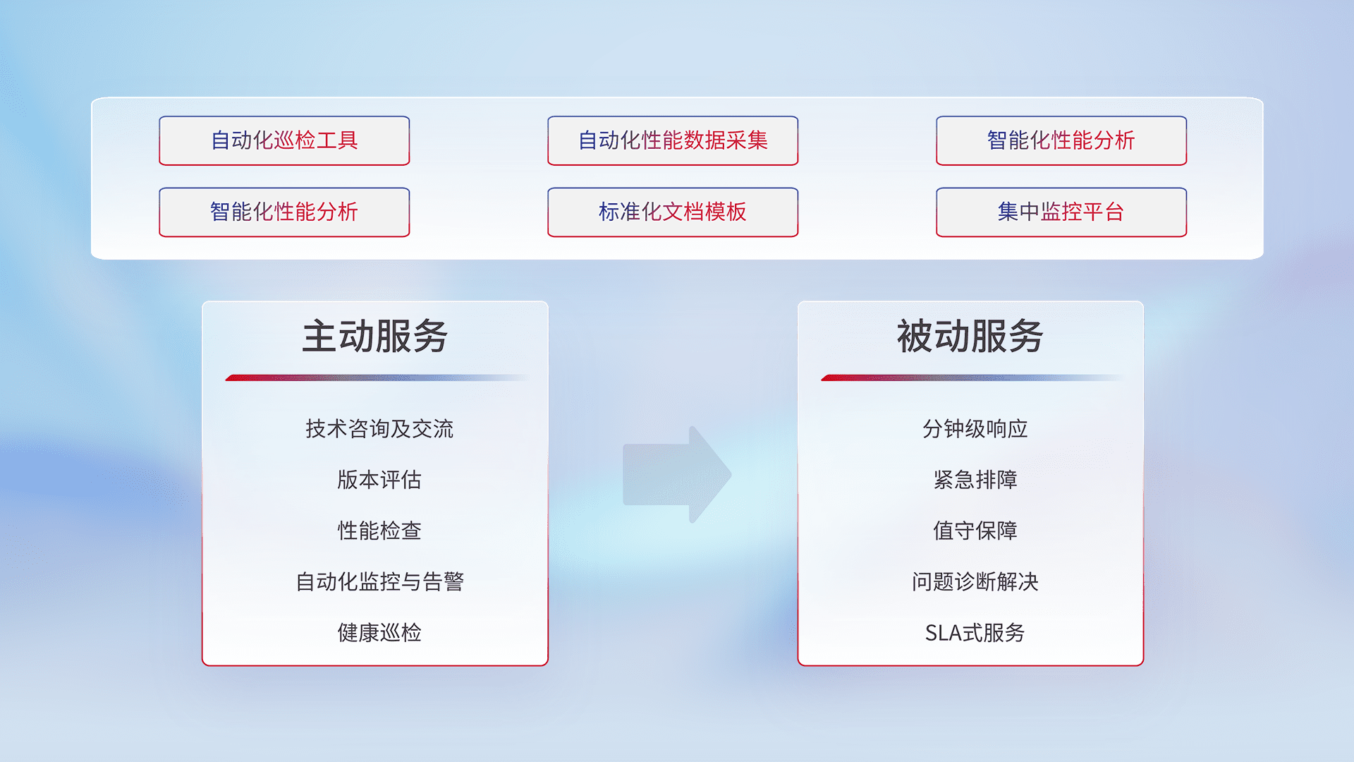 智能化工具和标准化文档,,,,保障服务质量,,,提供主动服务(包含技术咨询、、、、版本评估、、性能检查、、、自动化监控与告警、、健康巡检)和被动服务包含(分钟级响应、、、、紧急排障、、、值守保障、、问题诊断解决、、SLA服务)。。。